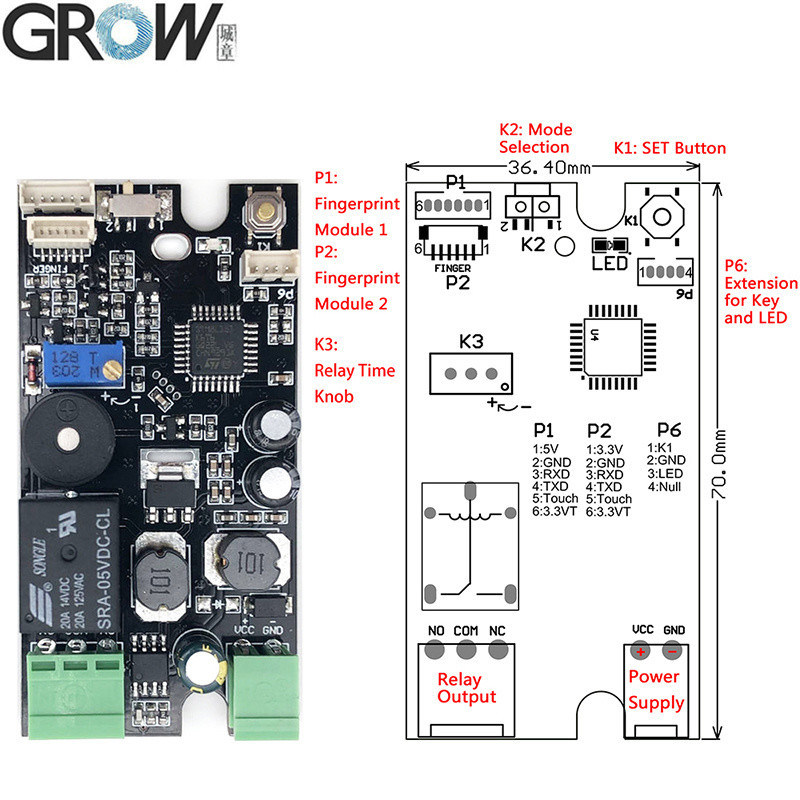 3. Uso de la selección de modo: cuando se elige 2, el tiempo de funcionamiento del relé es 1s-20s después de pasar la huella dactilar, se puede ajustar con la perilla. Cuando se elige 1, el relé se activa cuando se pasa la huella dactilar, y luego el relé se desactiva cuando se pasa la huella dactilar nuevamente, el relé se activa y desactiva cíclicamente. El relé se desactiva cuando se apaga.